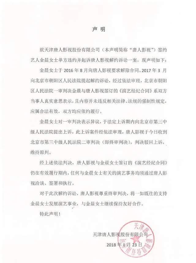 金晨在2016年8月要求与唐人解除合同,说白了就是辞职,于2017年3月提起诉讼,一审判决金晨必须继续履行合约。都已经撕破脸了,不可能就这样相安无事下去,金晨再接再厉继续向北京市第三中级人民法院上诉,法院在1月23日予以终审判决、驳回金晨的上诉,维持原判。
